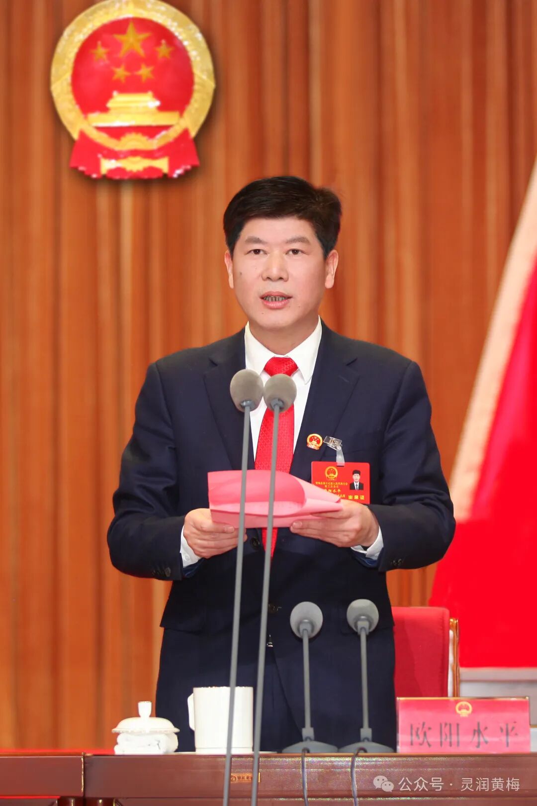 欧阳水平说全体人大代表是分布在全县各领域、各行业的创业之星、实干之星,要以此次会议为契机,当好会议精神的宣传员、落实会议的实干家,主动投身服务改革试点、流域综合治理、乡村振兴、招商引资、园区建设之中,当好示范表率,坚定发展信心,凝聚上下同欲新合力、共绘黄梅明天新壮景。要从千帆竞发、争先恐后的大格局中抢出赛道、挤出时间、拼出速度,用最高的效率把全县两会精神落实到改革、发展、稳定等重点工作、重点领域中,为全县人民群众谋取更多的民生福祉,最大程度提升人民群众的幸福指数。要大力弘扬踏石有印、抓铁有痕的精气神,一锤接着一锤敲,一步挨着一步跨,反复擂、重点擂,以奋进身姿不断争取人民群众对人大代表的信赖,以实效实绩实现人民群众对美好生活的向往。要在经济社会发展的主赛道上,以龙飞凤翥精神攻坚克难,以龙战于野的勇气奋发向前,以龙腾云海的气势拼搏争先,用人大代表的“龙行天下”换来黄梅发展的“龙行龘龘”!