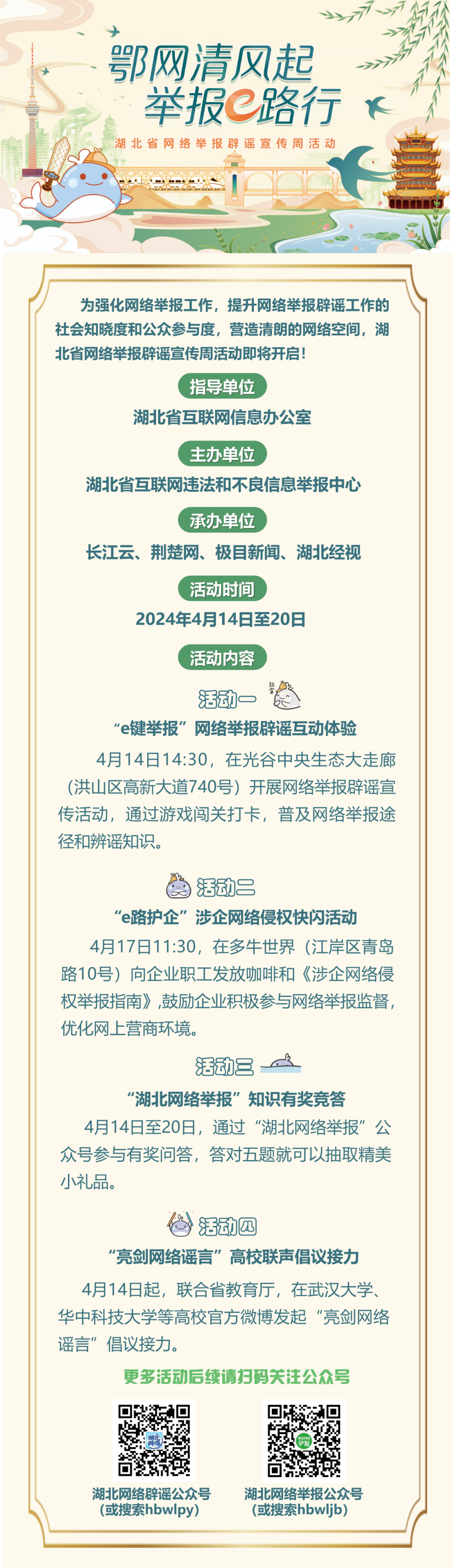 2024年4月14日至20日,湖北省互联网违法和不良信息举报中心将开展