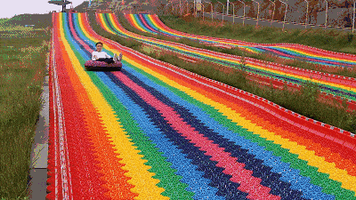 除了浪漫的玫瑰花海当然少不了刺激的游乐项目来助兴七彩绚丽的滑道