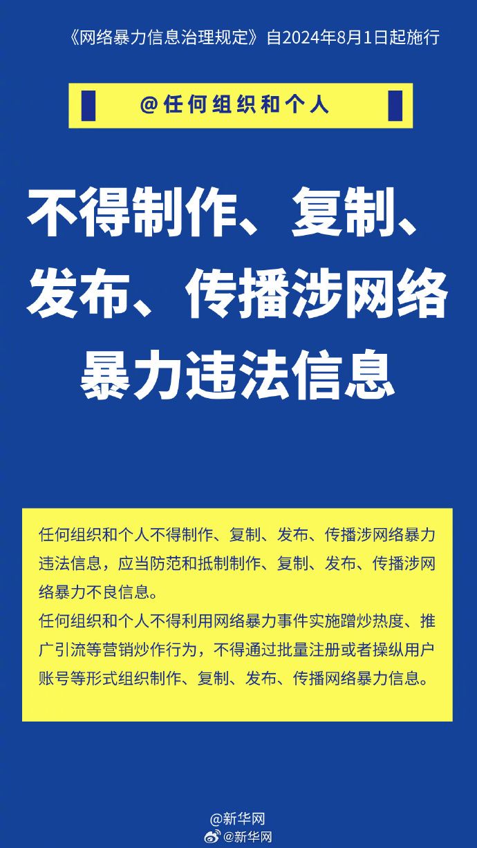 6月14日,国家互联网信息办公室联合公安部、文化和旅游部、国家广播电视总局共同发布《网络暴力信息治理规定》,该规定自2024年8月1日起施行。