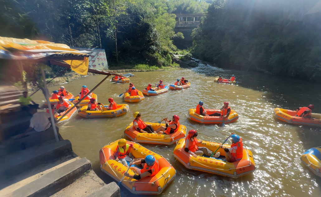 这个周末,吴狄,一位从深圳归来的初中生,带着朋友们一起回到了他的家乡黄梅,体验了这个令人兴奋的漂流项目。在专业工作人员的指导下,他们全副武装,头盔、护腕、救生衣一应俱全,乘坐橡皮艇在曲折的河流中穿梭,感受着速度与激情的完美结合。
