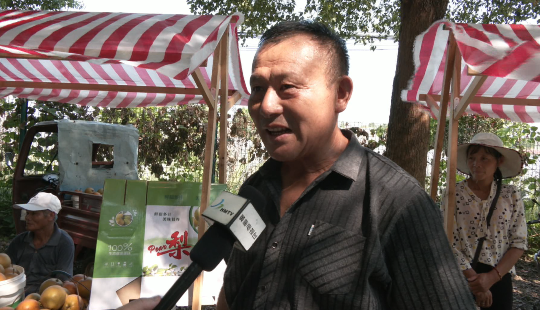 果农 黄雄军:我们渡河的梨子以前都在路边卖,政府考虑路边安全问题,让我们集中在五祖福果吉市售卖,又请来本地网红帮助直播带货,对我们果农十分关心,刚刚我就卖了上百斤的梨子。