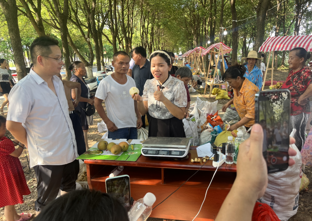 8月24日下午,五祖镇携手县商务创新服务模式,充分发挥电商直播在联农助农、吸引促销方面的独特优势,联合“乡野八妹”等网红直播团队,走进五祖福果吉市,开展了一场别开生面的直播带货活动,帮助当地果农拓宽销售渠道,将雪梨和板栗等优质农产品推向市场。