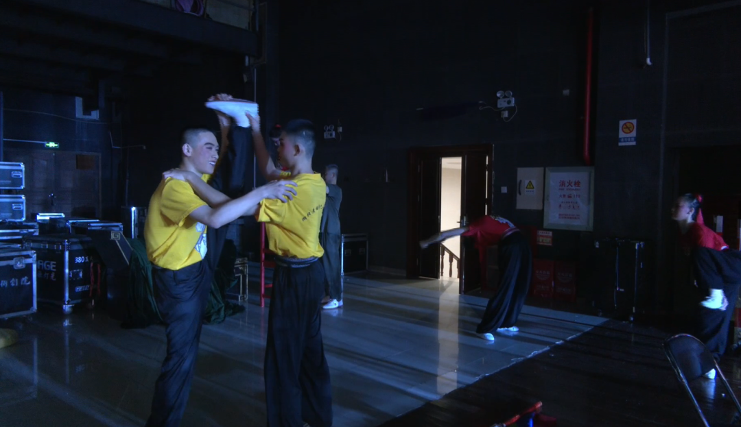 后台,一群“00后”演员手拿道具、妆容精致,或互相鼓励,或压腿练习,在略显紧张的氛围中等候上场。