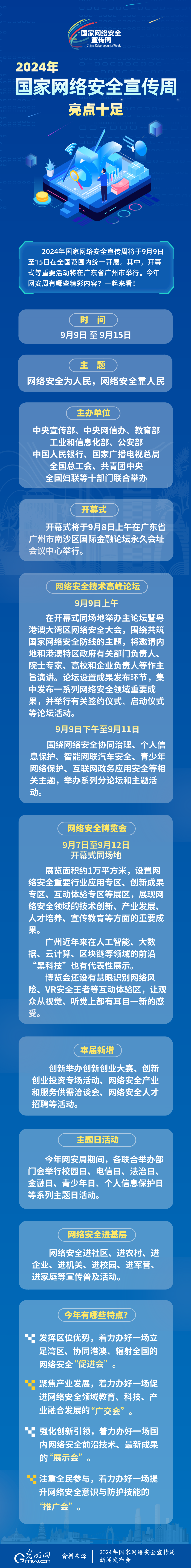 2024年国家网络安全宣传周将于9月9日至15日在全国范围内统一开展,9月8日在广东省广州市举行开幕式。
