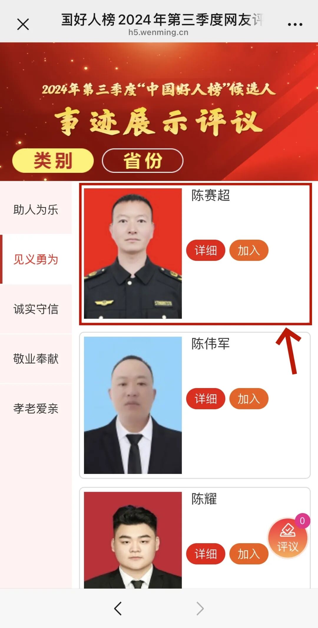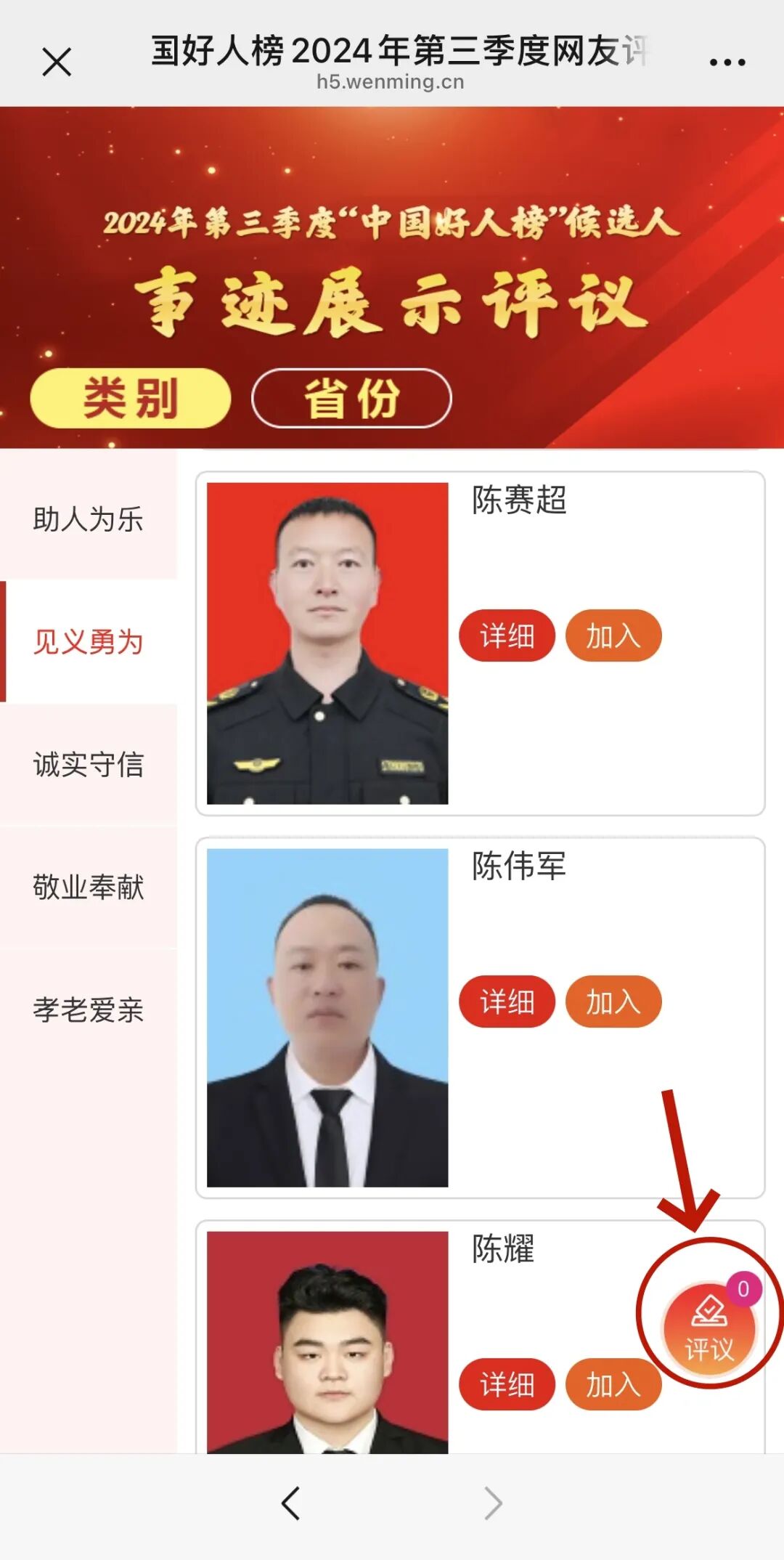 3、点击见义勇为一一点击加入(陈赛超)一一点击评议一一点击向他们学习