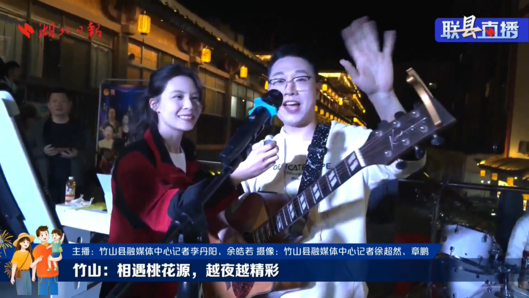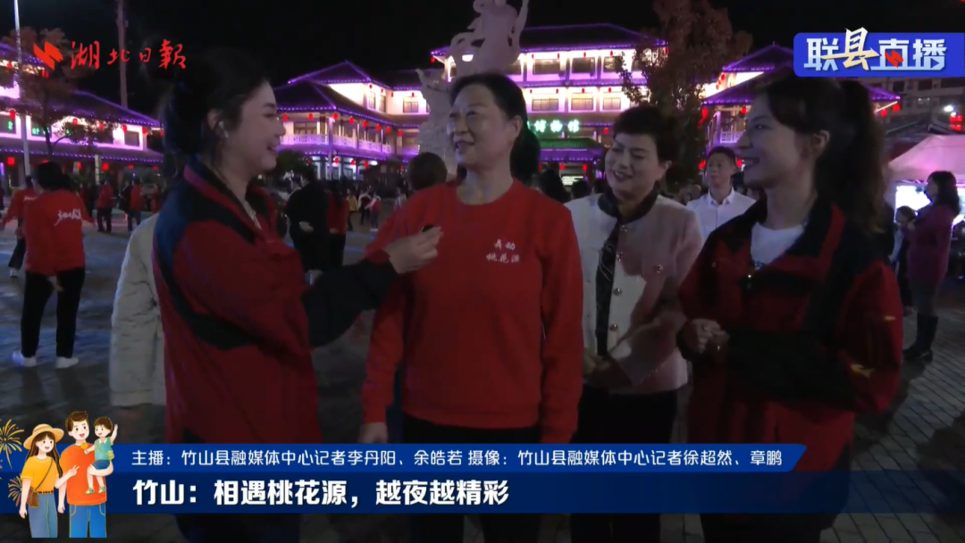 县人大常委会副主任周清荣做客直播间,担任主讲嘉宾,向广大观众介绍桃花源夜经济。当晚8点,当直播画面切到竹山县桃花源街区时,女娲广场上数百人正在齐跳广场舞,他们身着统一服装,个个精神饱满,动作整齐划一,现场画面十分壮观。