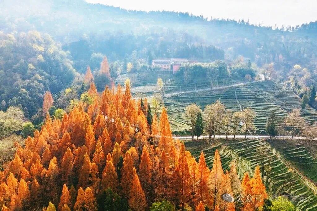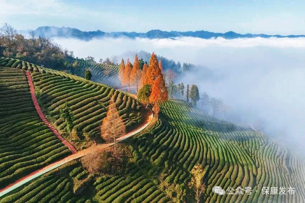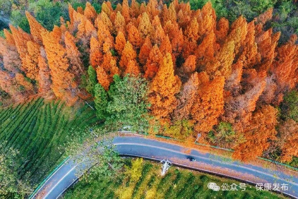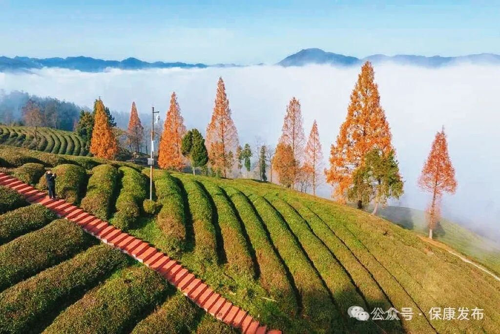 初冬时节,湖北襄阳保康县官山茶园的水杉树叶子的颜色渐渐由绿色变为金黄,一排排水杉在冬日暖阳下色彩艳丽,火红的水杉与墨绿的茶园在云海中若隐若现,景色如画,吸引游客前往欣赏。