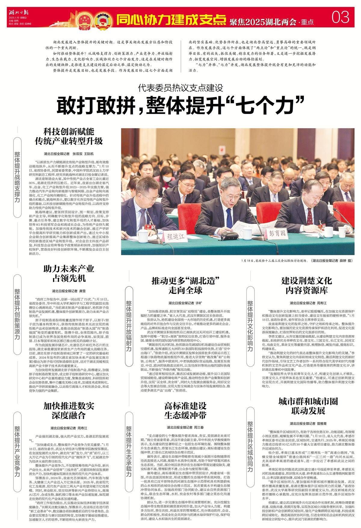 整体提升是发展目标,也是发展手段。作为发展目标,这七个方面是湖北的坚实基础、优势条件所在,也是湖北登高望远、勇攀高峰的重要领域所在。作为发展手段,这七个方面体现了“两点论”和“重点论”的统一,既是纲举目张、有的放矢,抓住关键、精准发力的任务部署,又是进一步挖掘发展潜力、拓宽发展空间、增强发展后劲的路径谋划。