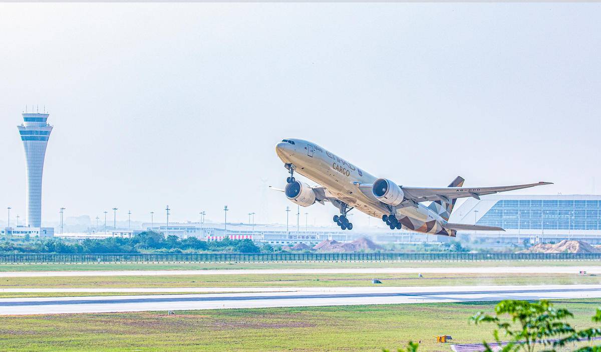 一架阿提哈德航空的全货机在鄂州花湖国际机场起飞。(湖北日报全媒记者 薛婷 摄)