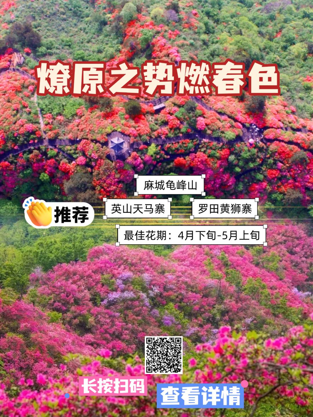 三十万亩野生杜鹃沿鄂豫皖交界处奔腾绵延,恍若女娲补天时遗落的赤练,又似祝融掷向云海的烈火长鞭,将“人间四月天”烧灼成最浓烈的注脚。(点击此处查看详情)