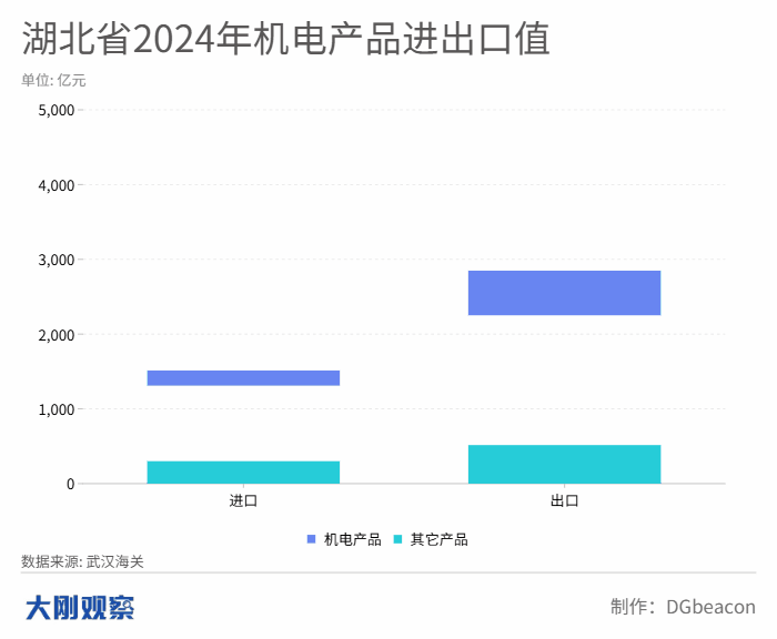然而,无论是进口商品还是出口商品,机电产品都占大头。2024年,湖北四成进口产品和超五成出口产品都在此类。