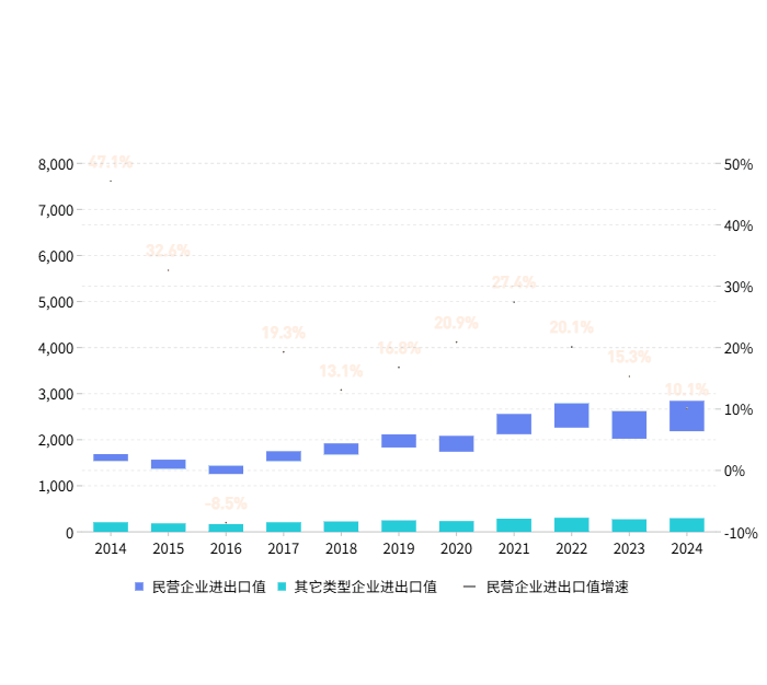 可以看到,过去十年,除个别年份,民营企业贡献的外贸值基本保持在10%以上的增幅。