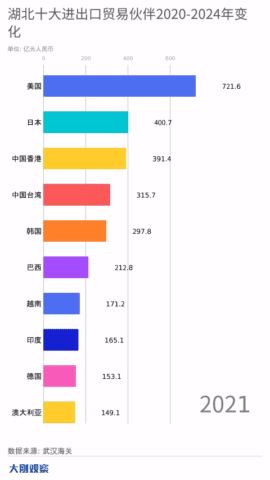 2021年,东盟再次反超,一直到2024年,东盟连续第四年成为湖北最大贸易伙伴。