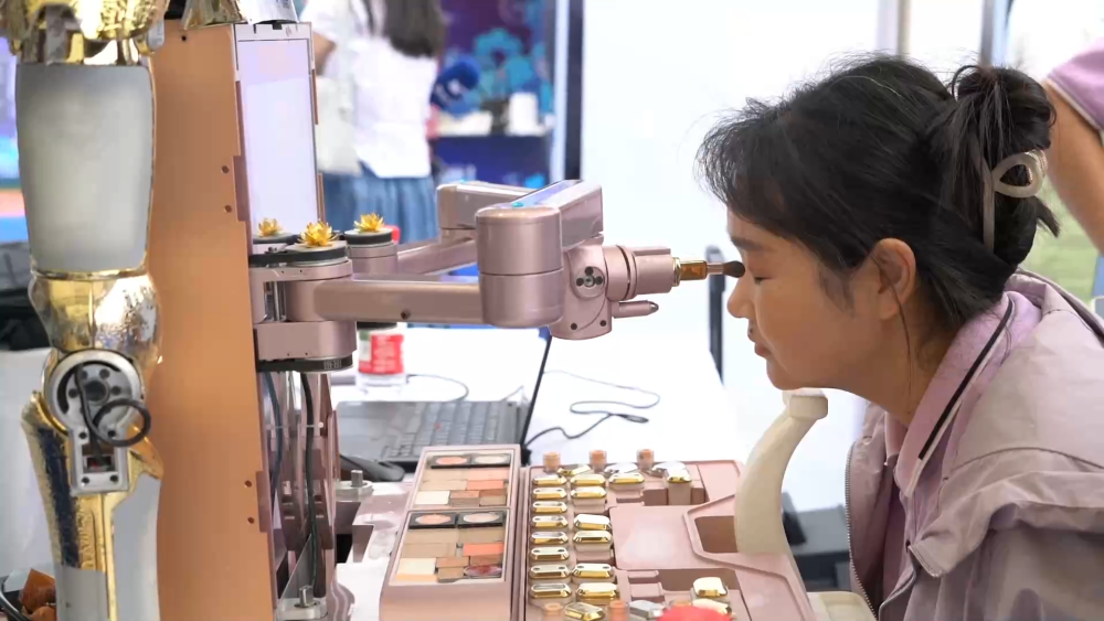 机器人组成的乐队带来了精彩的开场表演。在活动场地内,还有各种功能的机器人。比如智能补妆机器人,虽然没有人的手指灵活,但它有趣的功能吸引了众多观众来体验;这款外骨骼机器人可以绑在身上,协助人们行走;孩子们最喜欢和人形机器人互动;年轻的游客则品尝了机器人冲泡的咖啡。