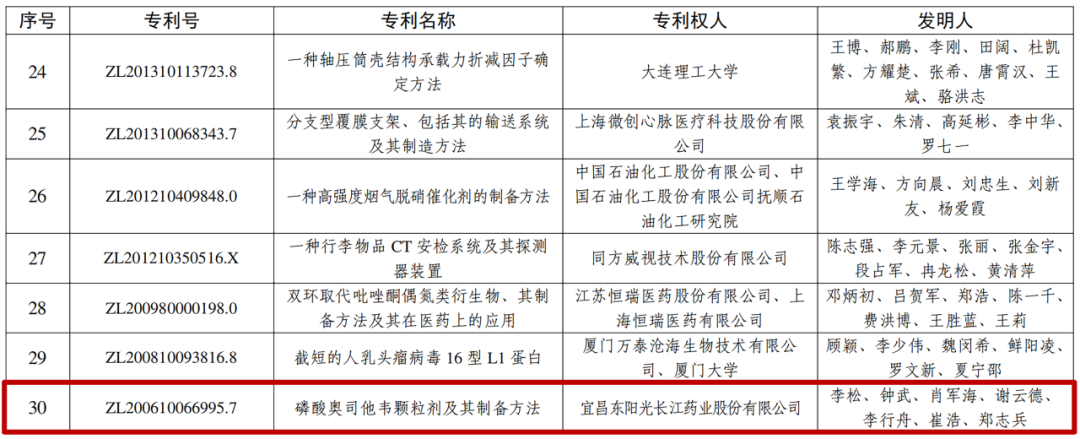 6月5日,国家知识产权局公开发布《国家知识产权局关于第二十五届中国专利奖授奖的决定》,宜昌东阳光长江药业股份有限公司的发明专利“磷酸奥司他韦颗粒剂及其制备方法”获得中国专利金奖,发明人是李松、钟武、肖军海、谢云德、李行舟、崔浩、郑志兵。