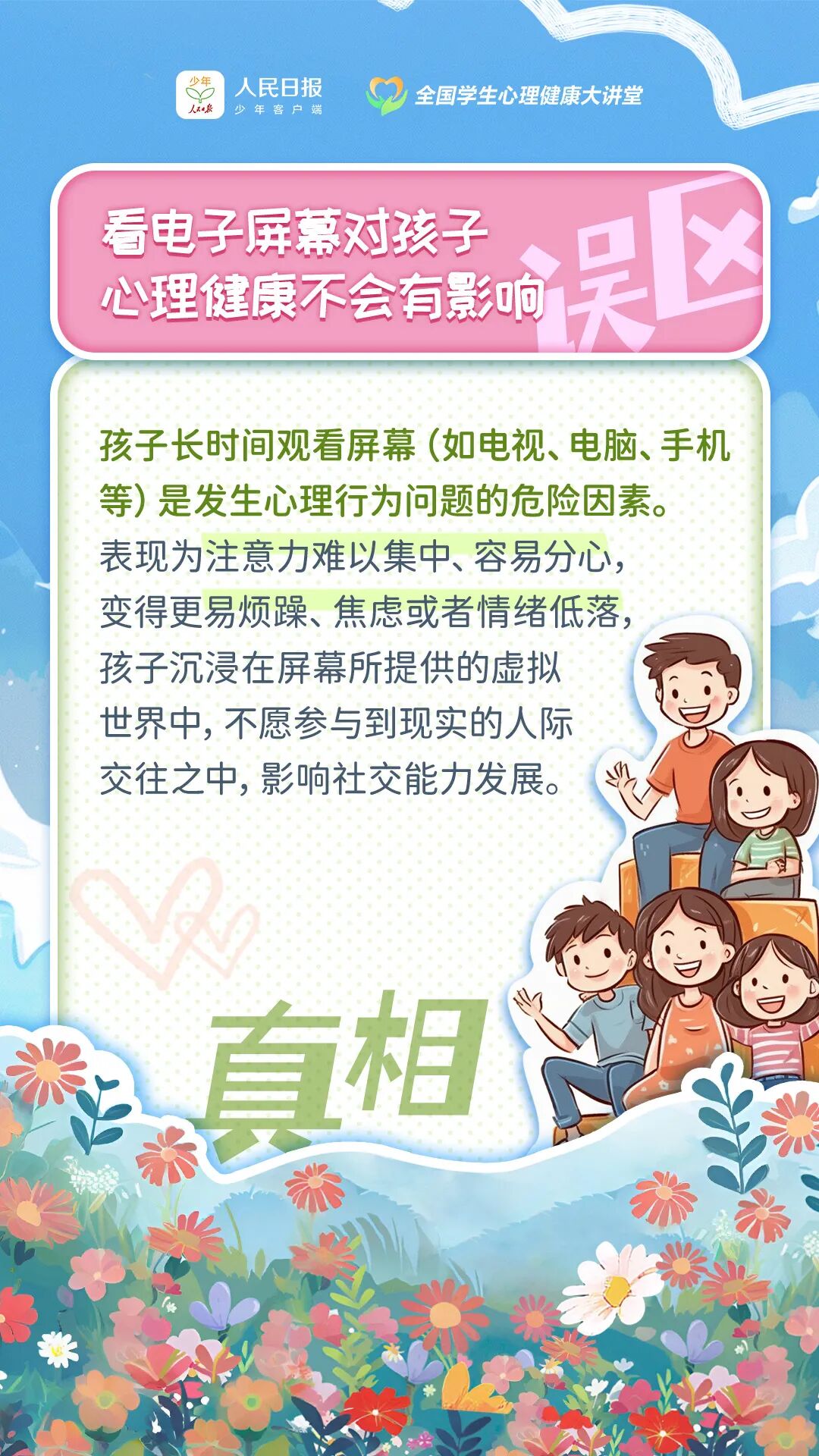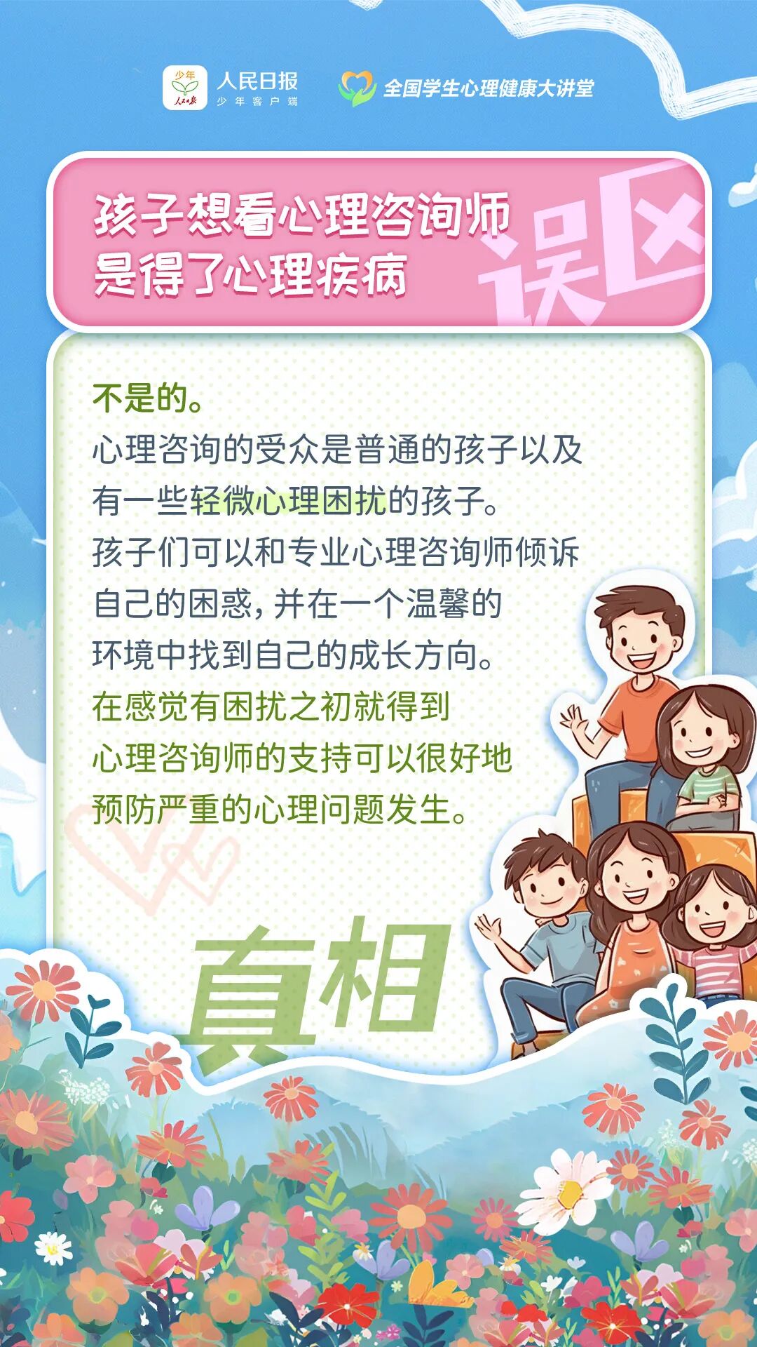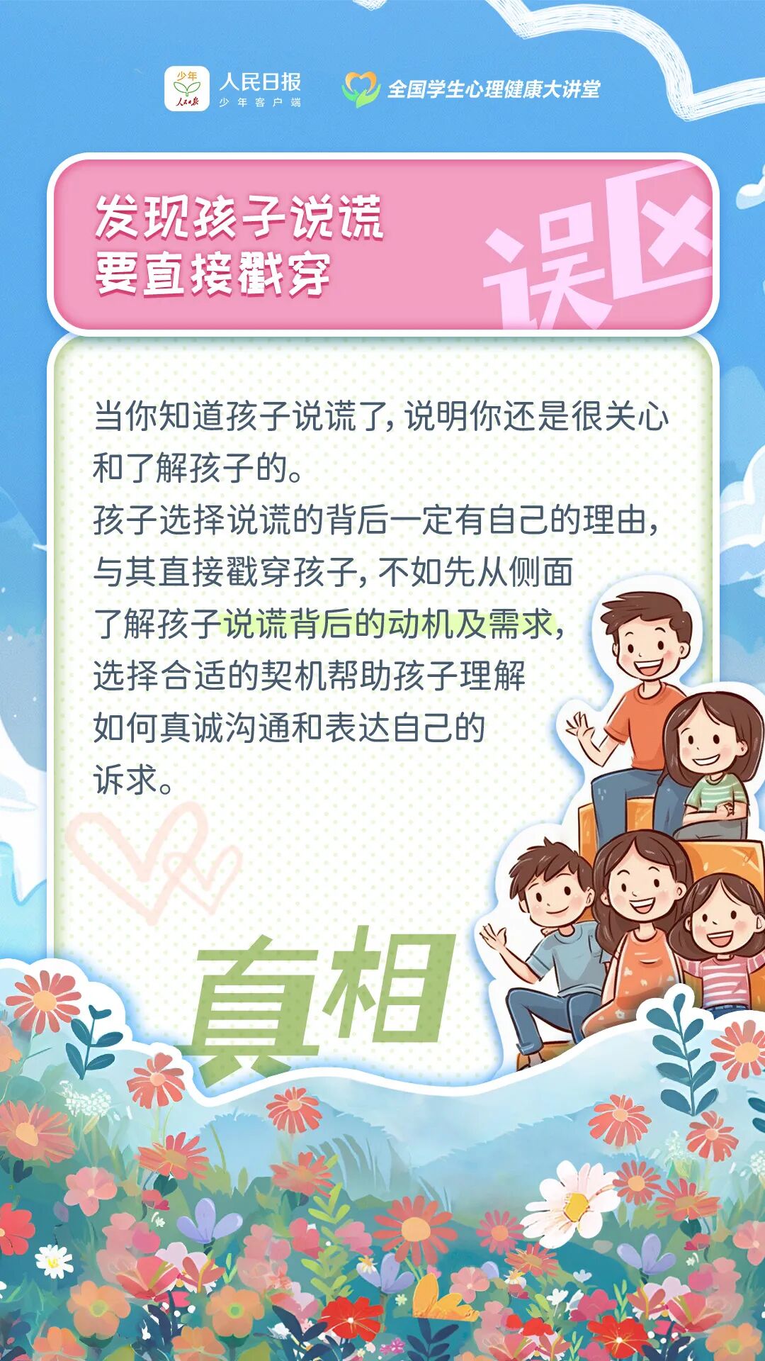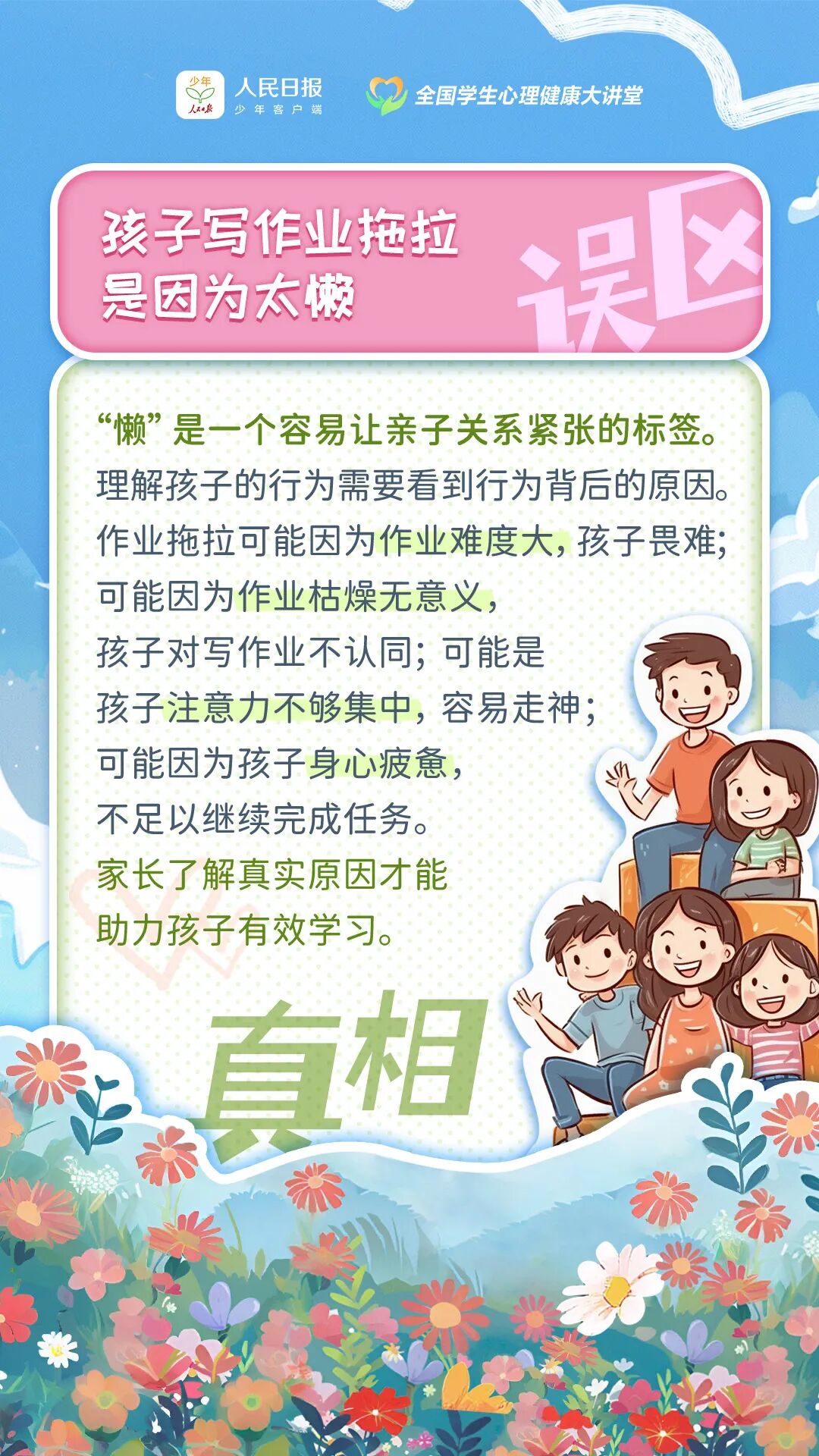 孩子写作业拖拉是因为太懒? 孩子“厌学”是一种疾病? 发现孩子说谎要直接戳穿? 孩子出现情绪问题可以自愈? …… 其实,这些都是常见的误区 让我们携手 共同关注孩子的内心世界 用科学的方法 护航孩子健康成长!