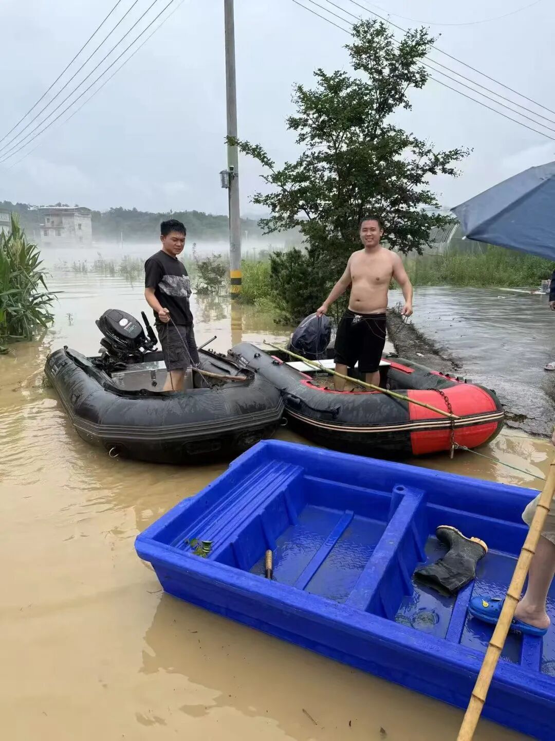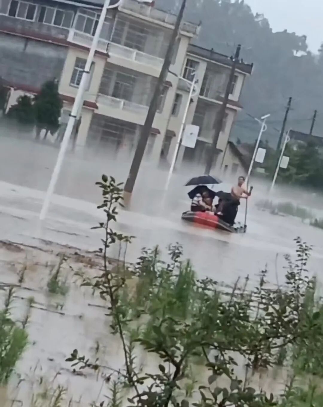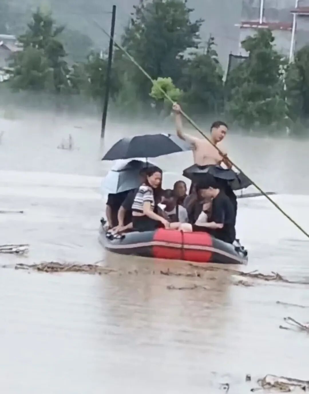 他们一起撑船穿行在洪水中