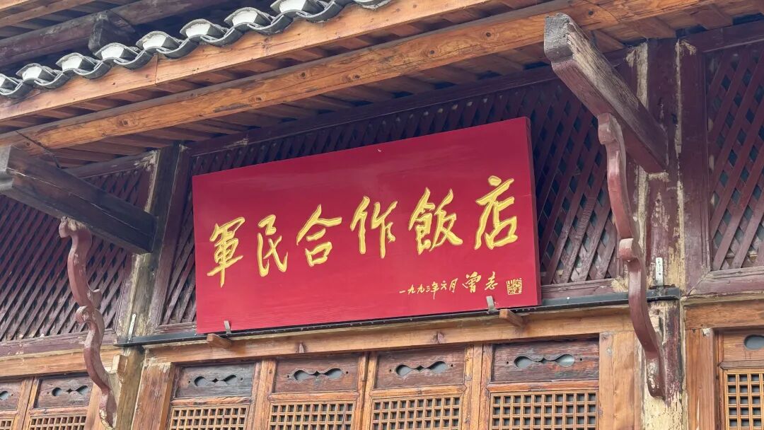 他口中的地方,正是承载着荆门特殊抗战记忆的市级文物保护单位——军民合作饭店旧址。门楣上,“军民合作饭店”六个大字遒劲有力,落款“一九九三年六月,曾志”,这是无产阶级革命家曾志同志在离世前五年留下的珍贵墨宝。
