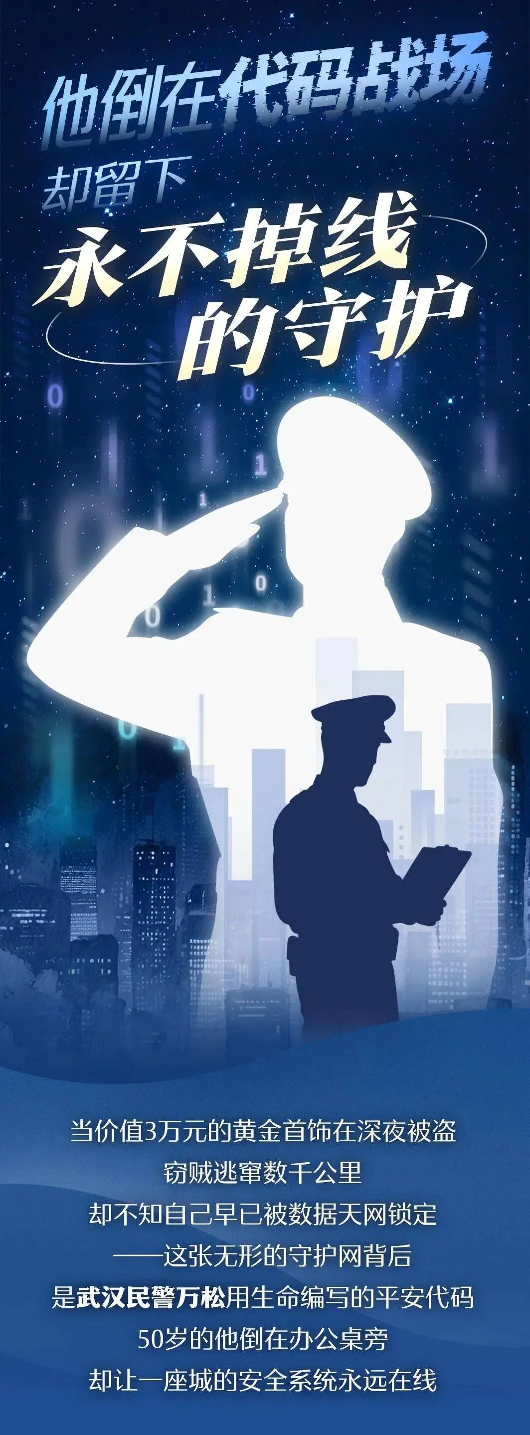 万松生前任武汉市公安局科技信息化支队三大队警务技术四级主任,曾先后荣立个人一等功1次、三等功5次。2025年5月26日,万松同志在组织完端午节安保风险研判后突发疾病,经送医抢救无效,于5月27日不幸牺牲,年仅50岁。