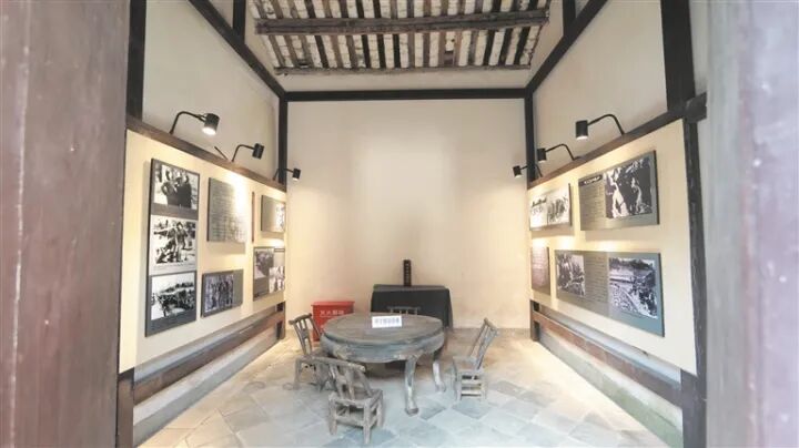 在左厢房里,陈列的照片讲述的是边区建政和根据地建设情况。“豫鄂边区的抗日民主政权是在这里诞生的。”李甫清指着一张泛黄的照片说。照片上是“豫鄂边区行政公署”印,旁边的另一张照片内容是《豫鄂边区施政纲领》。