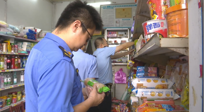 在一家超市,执法人员发现一包临近保质期的饼干,立即要求商家下架处理。“孩子们吃的每一样食品都不能马虎。”市监局工作人员指着货架说。