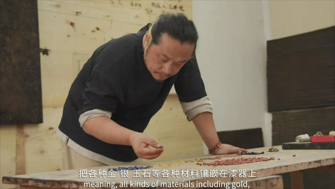 湖北美术学院手工艺术学院大漆教研室教师,中国美协漆画艺委会委员谭大利展示当代漆艺的传承与创新,“在我国的大漆史上,有一个著名技艺叫‘百宝嵌’,把各种金银玉石等各种材料镶嵌在漆器上,我现在的作品把宝石进一步碎片化,做出了我个人的表达的图案,但无论是审美还是技艺,都是在前人的基础上,都有根基的。”