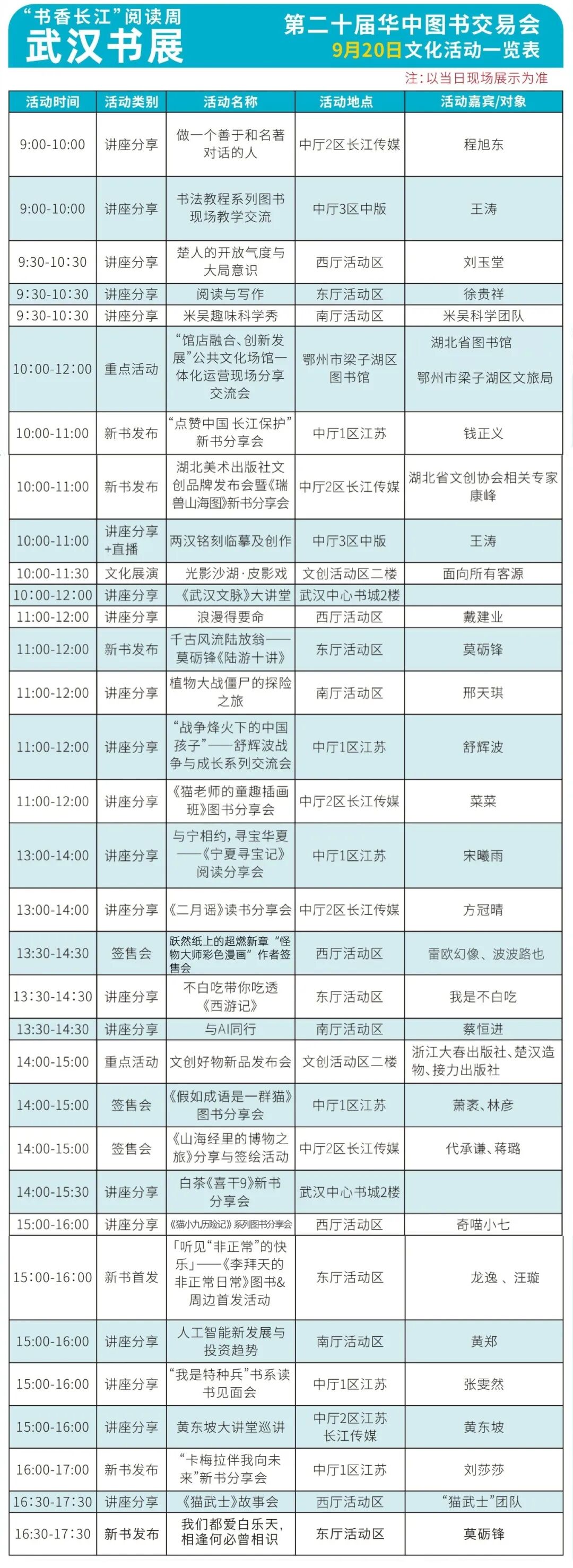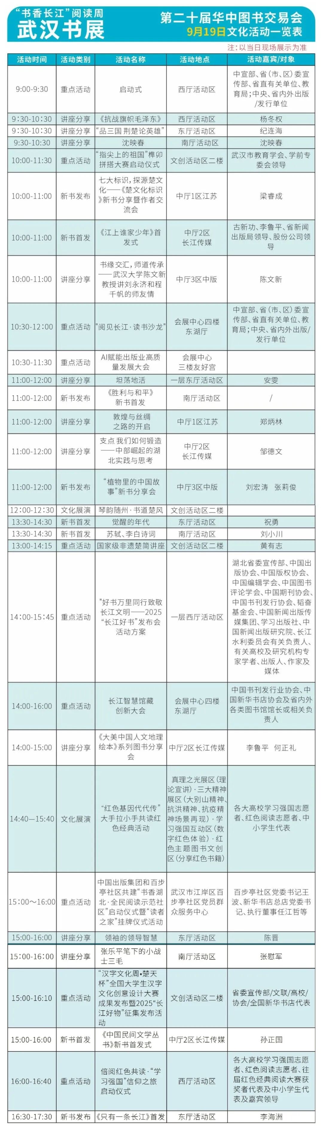 明天(9月19日)至9月21日作为2025长江文化艺术季活动之一2025“书香长江”阅读周·武汉书展将在武汉国际会展中心举办线下设立1个主会场15个市州分会场本届书展的文化活动分别有哪些?跟小布一起了解一下↓↓↓