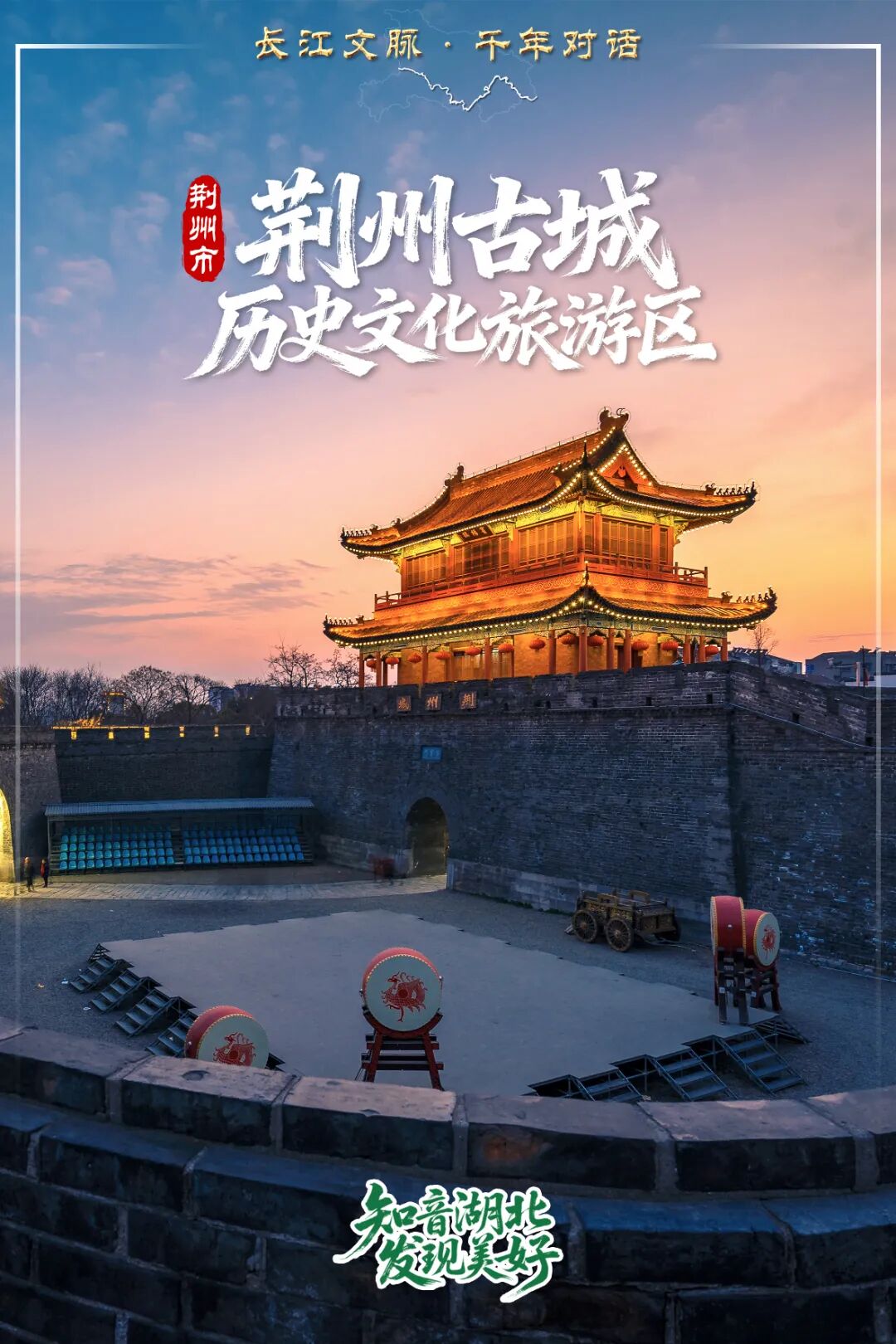 当夜幕浸透荆州,二千八百岁的历史古城骤然苏醒,宾阳楼化作金凤展翅的基座,九龙柱在光影中腾浪而起,屈原像沐着月光吟唱新的《九歌》。整座古城变成一座没有边界的楚文化剧场,天地人和四重乐章随护城河的波光流淌。