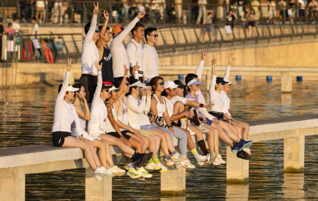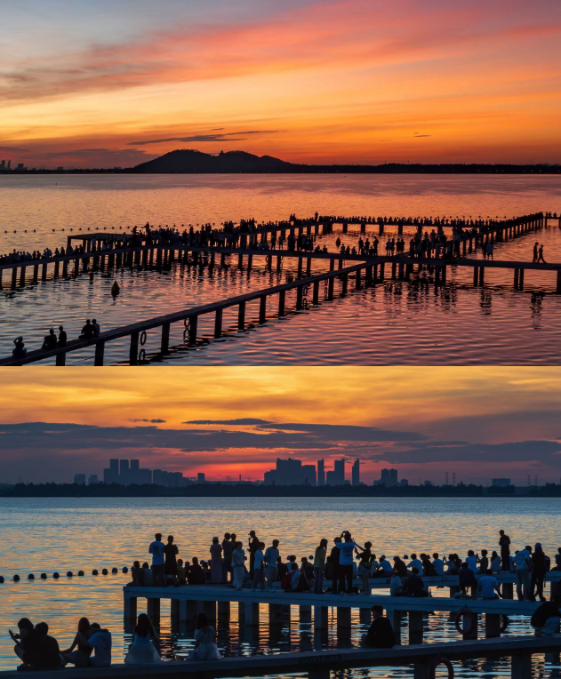 有网友记录了今夏来凌波门看“世纪朝霞”的感受:4时50分左右,先是天际线裂开一道金光,之后它像是被点燃的火焰,红的、橙的、粉的、金的……整片天空都在“燃烧”,湖水也被染成橘子海,手机拍不出它万分之一的美……5时30分,耳边的鸟鸣声逐渐清晰,湖畔开始冒出晨跑的人、踩水的小孩子……