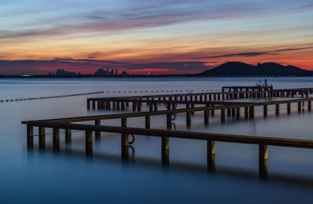 相比看日出,一部分人更爱它的“蓝调时刻”。蓝调时刻通常指日出前和日落后的半小时。此时,光线柔和,天空呈现出由浅入深的蓝色,浩渺开阔的东湖往往让人产生是海的错觉。黄昏过后,沿着湖面亮起的街灯、远方的城市霓虹与建筑剪影,又为这水天一色的蓝增添了电影镜头般的浪漫。不少人感慨,盛夏的武汉凌波门,让人仿佛置身于La La Land(电影《爱乐之城》中场景)。