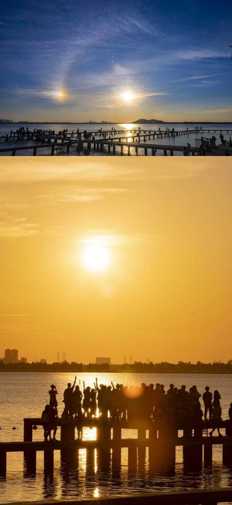 “看到太阳跃出湖面,浮光跃金的那一刻,觉得一切都值了。” 在社交平台上,众多博主连发十几张图,分享来此看完日出的心情。他们整理好“攻略”:一定要早到,最好4时20分就来抢最佳机位;穿浅色衣服,你大概率能拍到你的“人生照片”;栈桥人多,要小心别让手机掉进湖里……