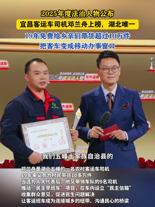 12月4日晚,央视社会与法频道播出的《2025年度法治人物发布盛典》节目中,当主持人问及车上装了哪些货物时,邓兰舟这样回答道。