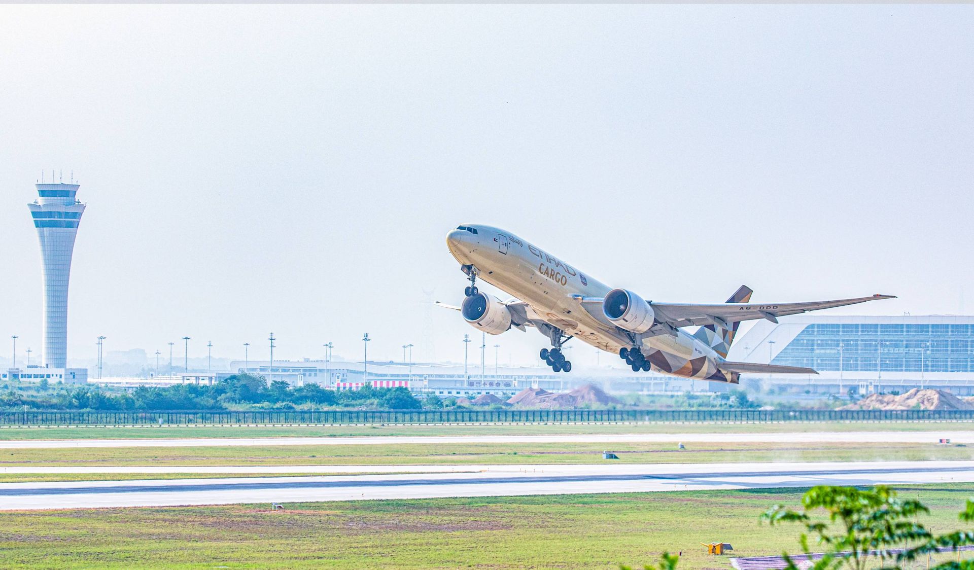 一架阿提哈德航空的全货机在鄂州花湖国际机场起飞。 (湖北日报全媒记者 薛婷 摄)