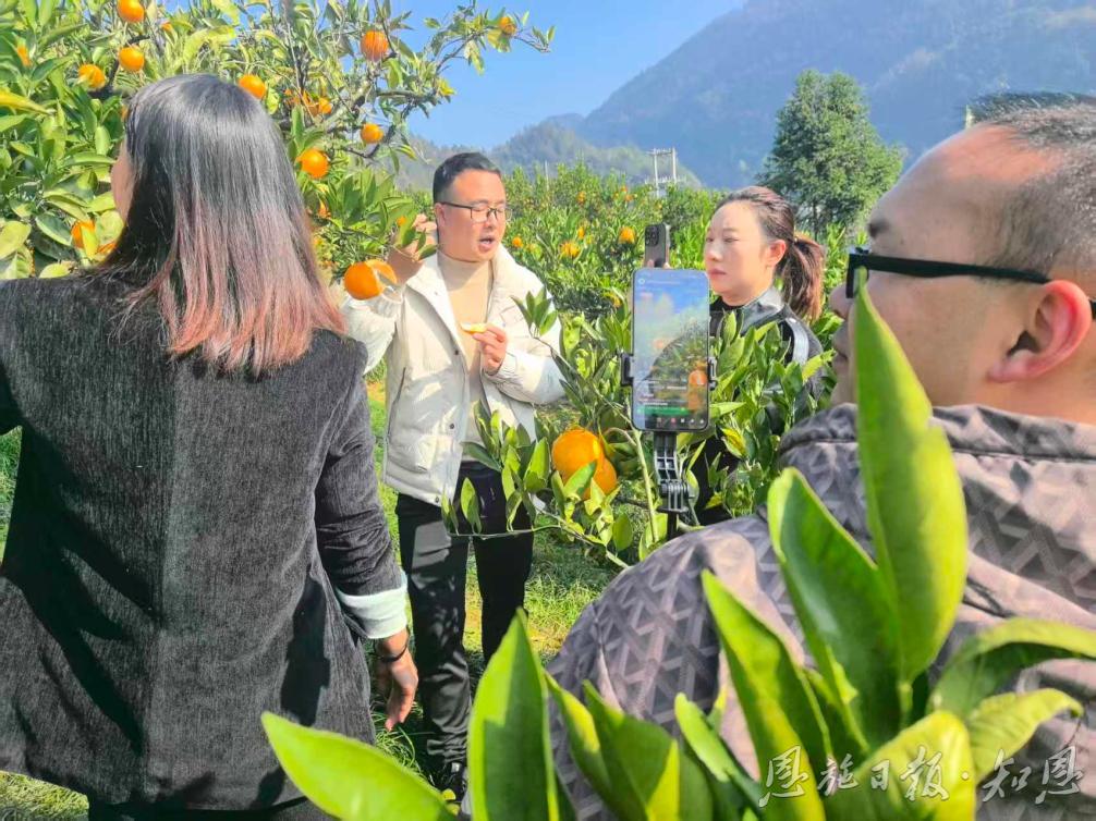村干部在长堰塘柑橘园里助农直播。蒲丹 摄