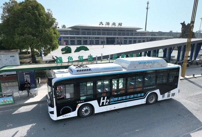 氢能公交车行驶在大冶街头