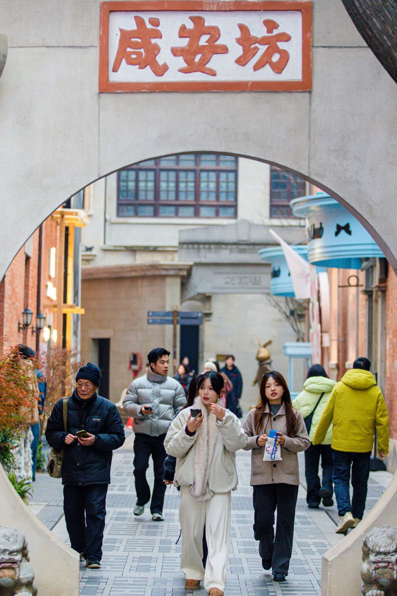 “这里太漂亮啦,随便拍照都是大片!”元旦当天,来自湖南长沙的陈女士与闺蜜在咸安坊的“心动天幕”下不停按下快门。