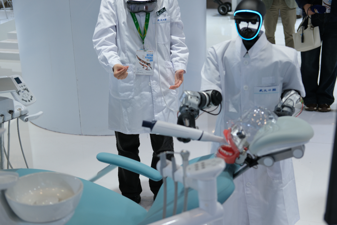 在第七届中部国际口腔展武汉大学口腔医院展位上,人形机器人跟随口腔医生手部轨迹隔空操作。(资料图)