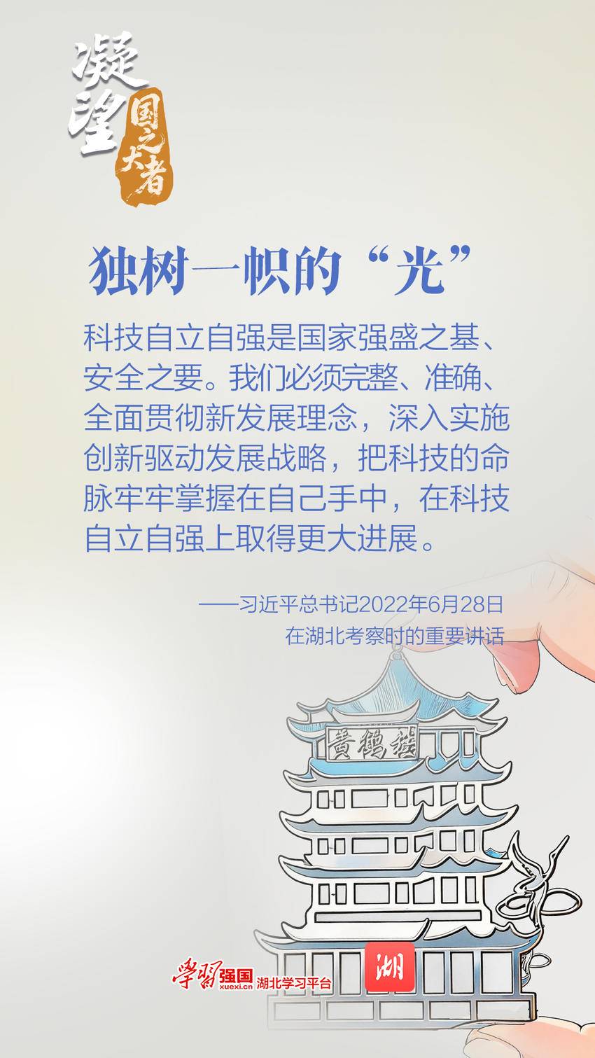 总书记将激光设备切割而成的小“黄鹤楼”,拿在手中仔细端详,叮嘱大家:“把科技的命脉牢牢掌握在自己手中,在科技自立自强上取得更大进展。”