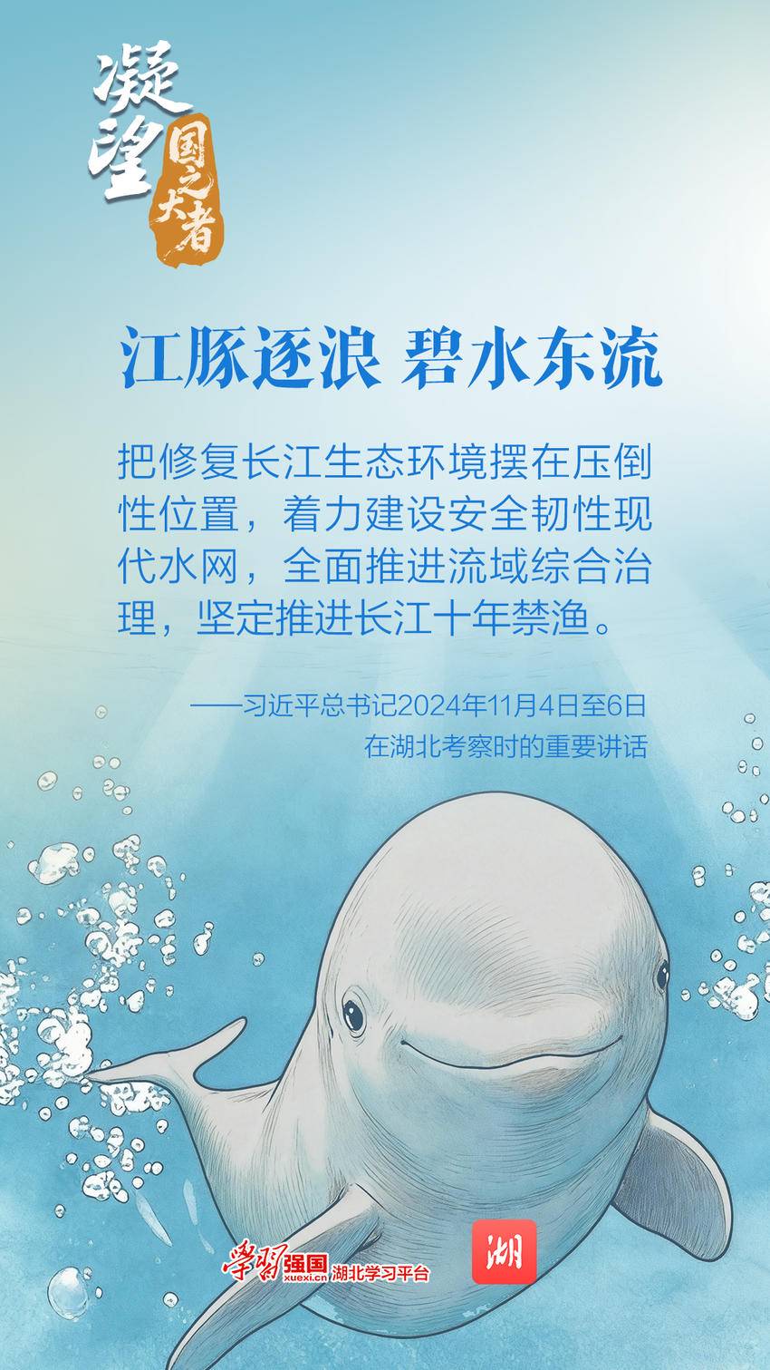 湖北是长江干线径流里程最长的省份。为了“一江清水东流、一库净水北送”,湖北深入实施长江高水平保护十大提质增效行动、长江经济带降碳减污扩绿增长十大行动,一体推进禁渔、治岸、增绿、活水。截至目前,全省已完成全部12480个长江入河排污口整治。长江干流湖北段水质连续七年保持Ⅱ类,丹江口水库水质长期优于Ⅱ类。江豚逐浪、麋鹿欢腾、候鸟翩跹的画面,已成为湖北的一张亮丽生态名片。