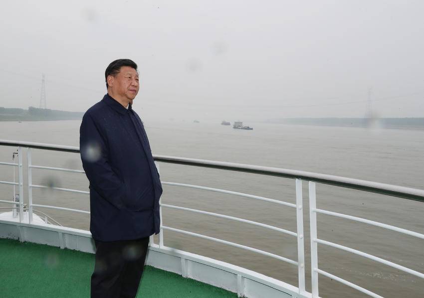 2018年4月25日,习近平总书记从荆州港码头登上轮船,沿长江进行考察。总书记来到甲板,凭栏眺望。长江边,他留下殷殷嘱托,“一定要给子孙后代留下一条清洁美丽的万里长江”。