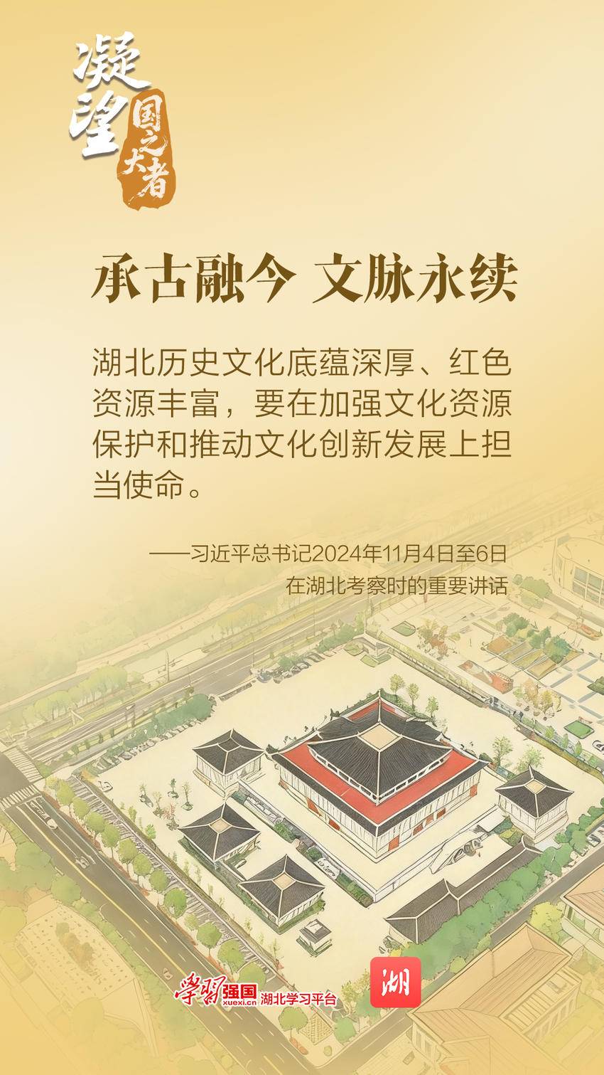 牢记嘱托,荆楚大地文脉焕新。湖北率全国之先成立长江文化研究院、发起“长江考古联盟”,全省规上文化企业达4213家、居全国第六,第5家“国字号”考古遗址公园挂牌,楚剧、舞剧绽放楚风楚韵,5.6万余名文艺志愿者、荆楚“红色文艺轻骑兵”足迹遍布全省。从文物修复到创新传播,从学术深耕到文旅融合,荆楚文化正以鲜活姿态,书写着“国之大者”的时代答卷。
