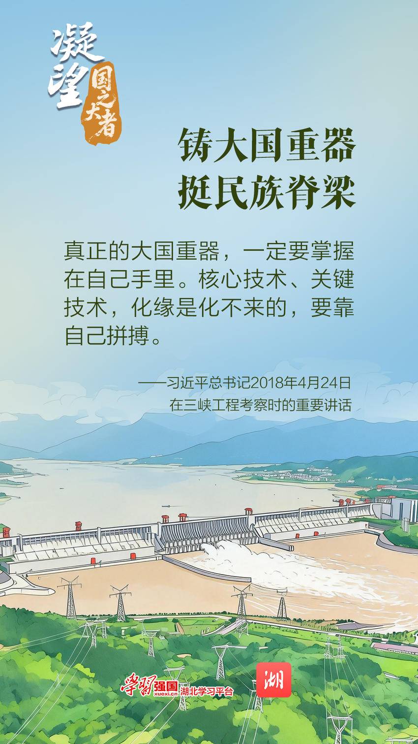 2018年4月24日,总书记登上三峡坝顶极目远眺,详细了解工程建设等情况,谆谆嘱托:“真正的大国重器,一定要掌握在自己手里。核心技术、关键技术,化缘是化不来的,要靠自己拼搏。”