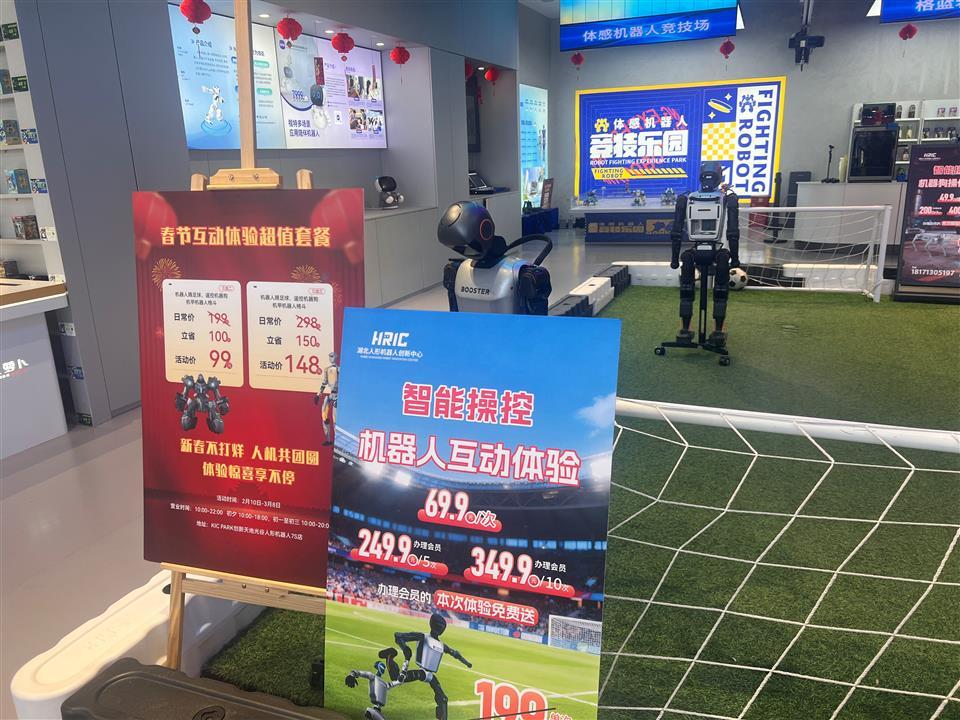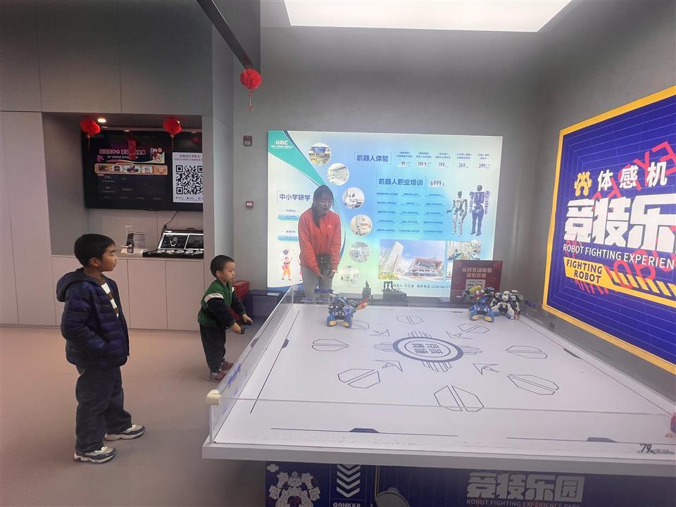 针对春节市场,该店推出机器狗互动、机器人踢足球、体感操控机器人“三件套”,定价148元。这一亲民价格精准击中亲子家庭需求,成为外地游客“必玩项目”。