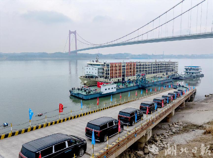 2月10日,黄石港棋盘洲港区10号滚装泊位正式开港,首批18辆“黄石造”长城汽车通过“民贵”号滚装船发往重庆,实现该品牌首次在黄石经水运外销。视界网 石勇 摄