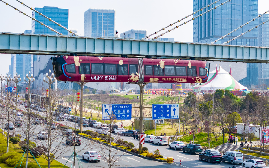 2月19日,大年初三,全面换装的光谷空轨新春主题列车,满载游客穿行在中央生态大走廊上空。湖北日报 魏徕 摄