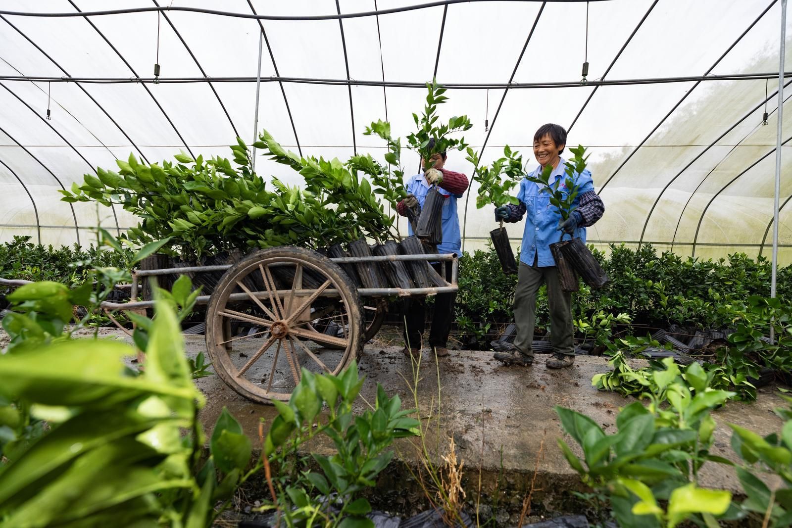 工人正在柑橘培育大棚内搬运苗木。通讯员彭强 摄