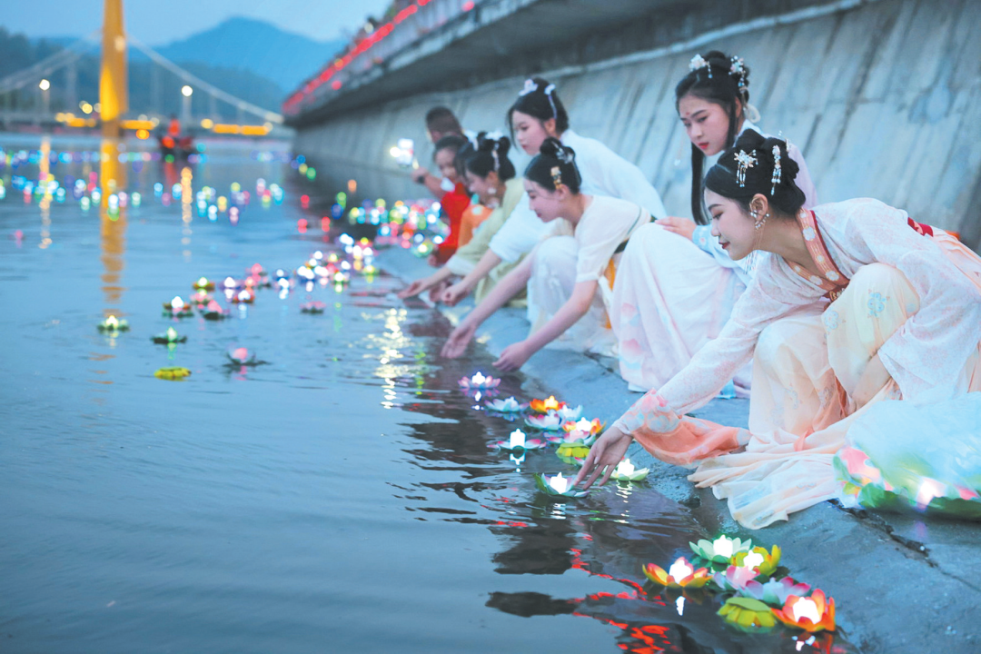 2023年郧西天河七夕文化旅游节,“织女”在天河之畔放河灯。(资料图)