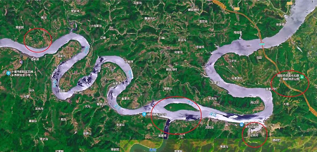 卫星地图看郧阳汉江河,红圈从左至右依次为弥陀寺学堂梁子(“郧县人”)遗址、韩家洲、辽瓦店子遗址、湖北青龙山恐龙蛋化石群国家级自然保护区所在地。(资料图)