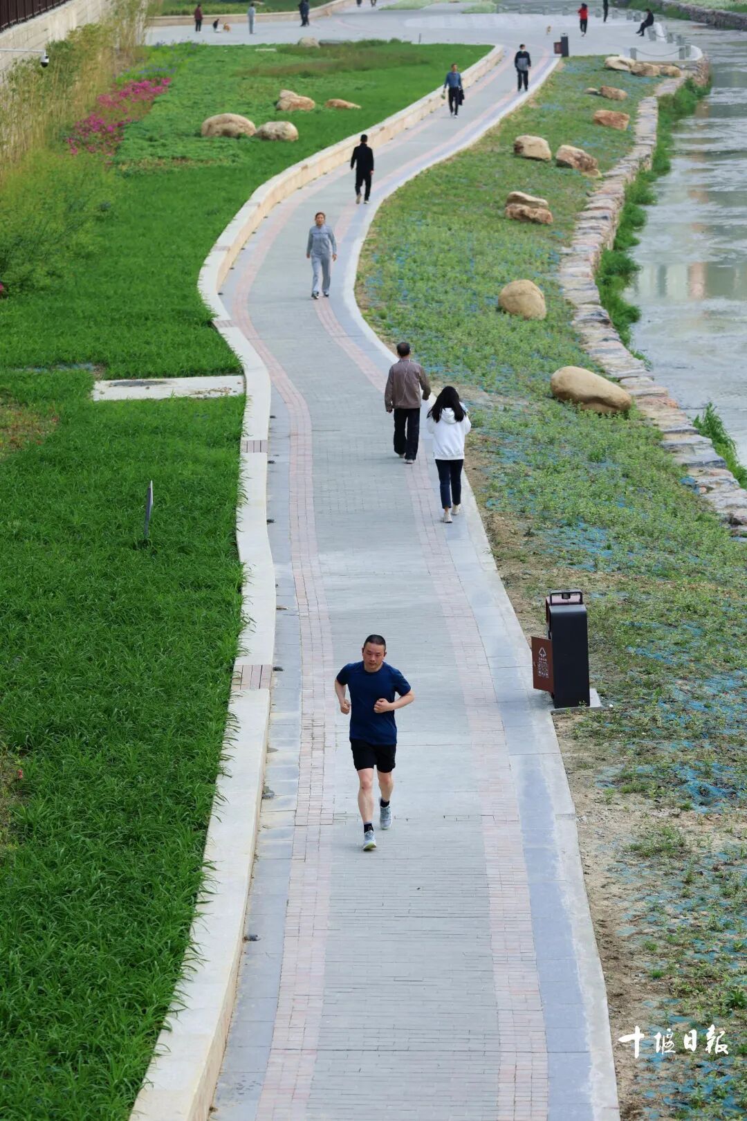 市民在百二河道游步道跑步。
